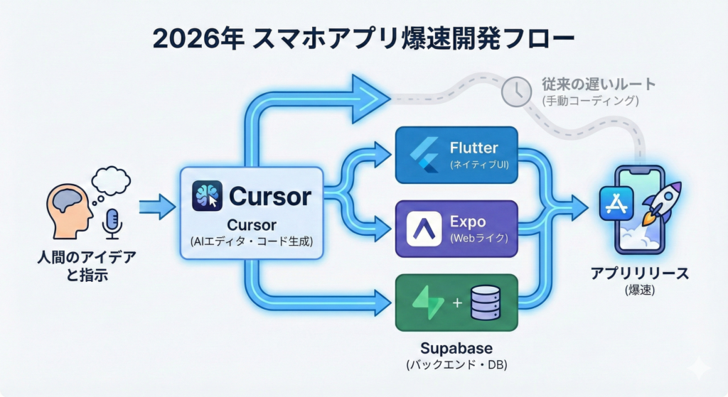 2026年版:スマホアプリ開発の『爆速』新常識 — Cursor × Flutter (or Expo) × Supabaseで数週間を数日に