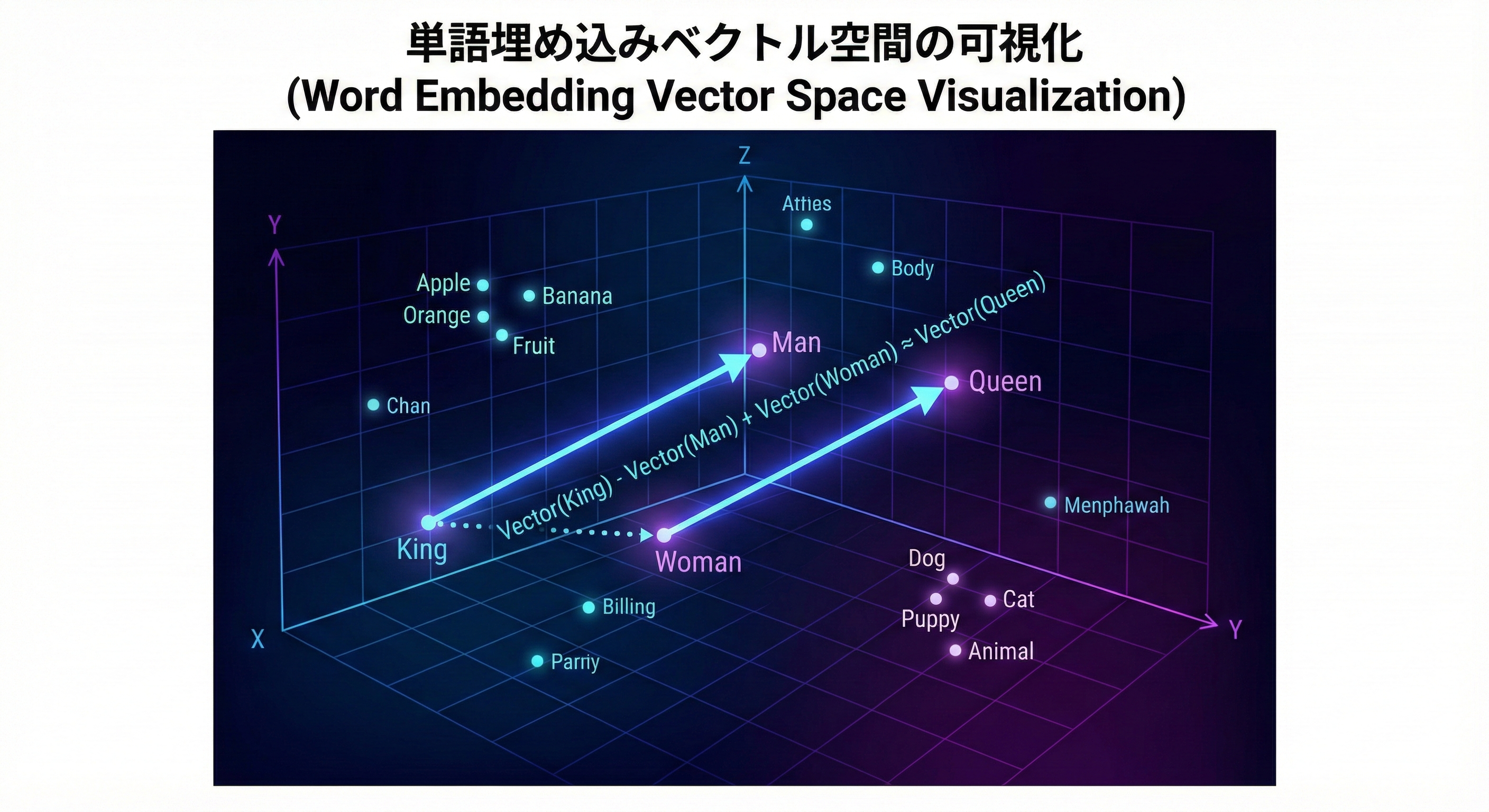 彼らは単語を**「多次元のベクトル(数値の配列)」**として扱っています。