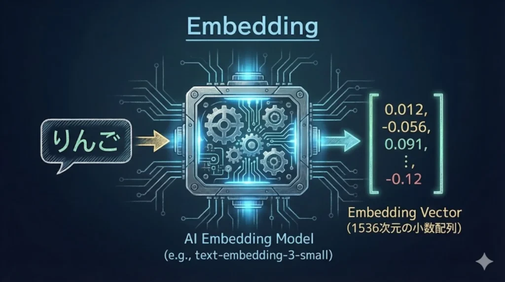 エンジニアなら一目瞭然ですね。embedding の中身は、1536個の要素を持つただの配列(Array)です。 AIは「りんご」と「みかん」の意味を理解しているわけではありません。「りんご」を入力したときの配列と、「みかん」を入力したときの配列の**「数値的な距離が近い」**というだけです。