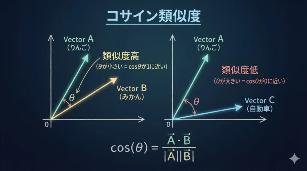 そして「検索」の正体は、中学や高校の数学で習った**「コサイン類似度(Cosine Similarity)」や「ユークリッド距離」**の計算です。 ユーザーが入力した検索クエリを配列に変換し、データベース内の全配列と引き算(または内積計算)をして、結果が「1(完全一致)」に近いものから順番に並べ替えて(ORDER BY)返しているだけなのです。